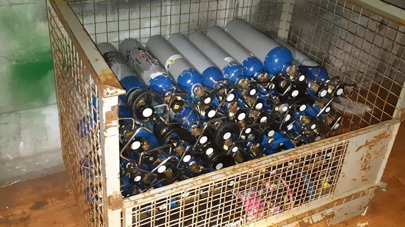 De politie ging op onderzoek uit nadat zij een bestelbus zagen staan bij een loods op een industrieterrein aan de Oude Industrieweg. Na wat onderzoek bleek er sprake te zijn van een levering tussen twee bedrijven die zich richten op de handel van lachgas. Zowel in de bestelauto als in de loods werden grote hoeveelheden lachgascilinders aangetroffen.