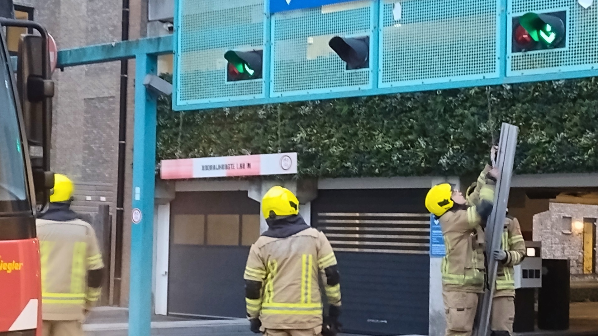 Niet veel later rukte de tankautospuit uit naar het Scheldeplein. Daar hing boven de inrit van de parkeergarage een plank los met het opschrift “Doorrijhoogte 1,98 meter”. Brandweerlieden hebben de zwalkende plank naar beneden gehaald met behulp van een nijptang.