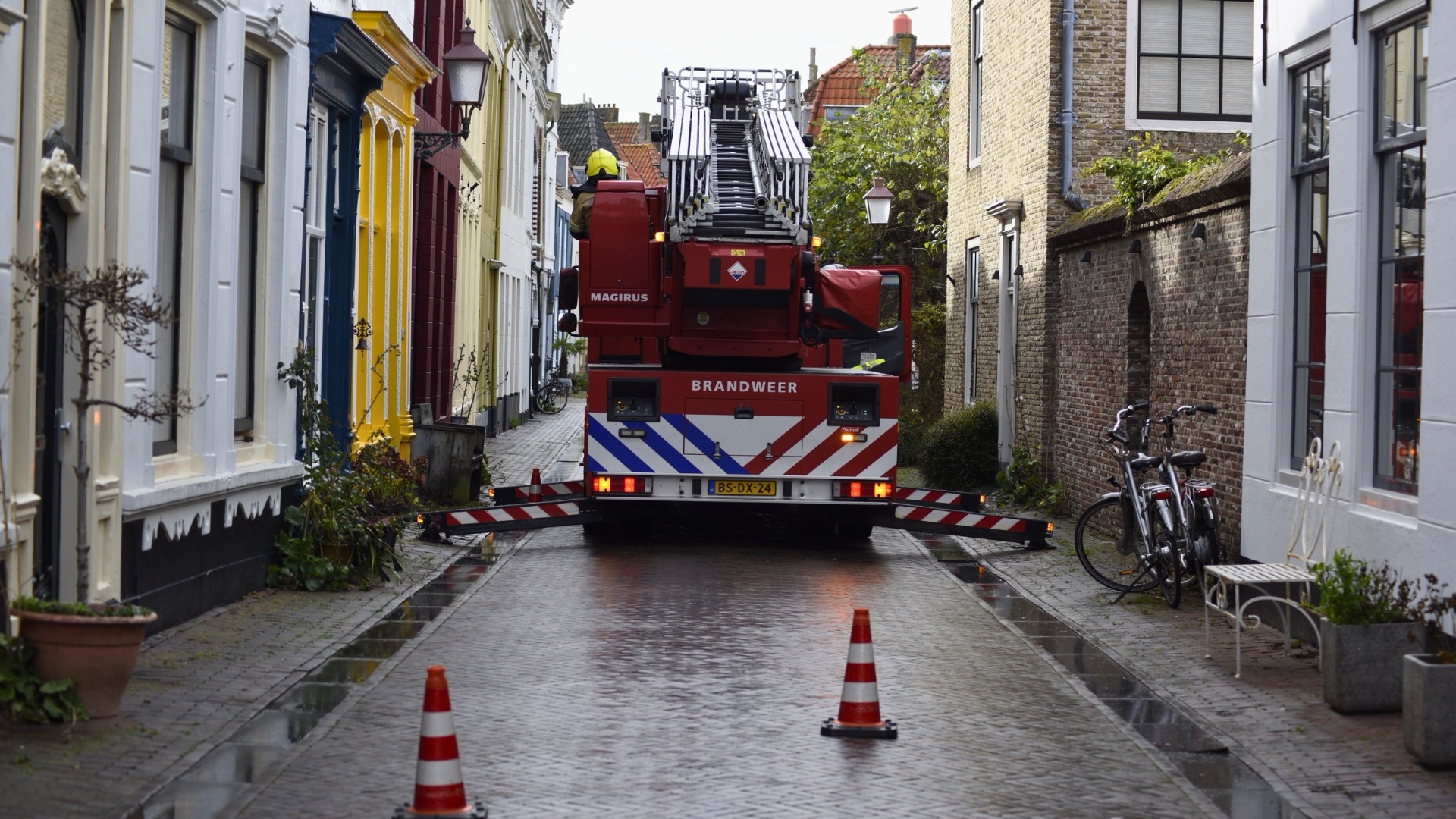 Even na 12.00 uur werd de autoladder opgeroepen. Ter plaatse gingen twee brandweerlieden via het bakje omhoog om het beschadigde glas veilig te verwijderen. De straat werd hiervoor tijdelijk afgesloten.
