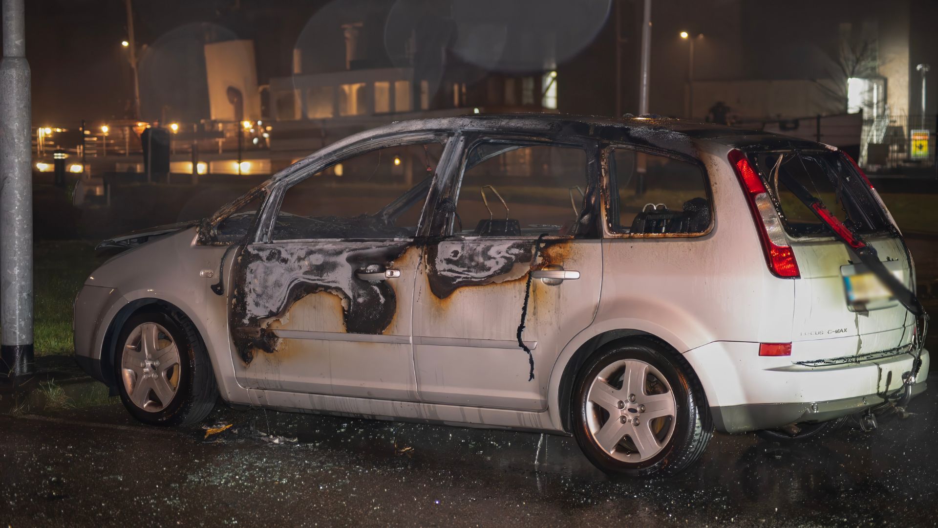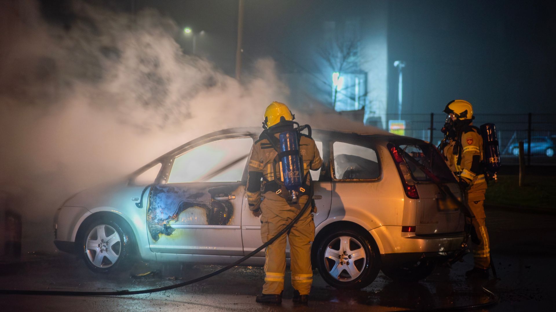 Het brandende voertuig werd kort na 01.00 uur ontdekt op de parkeerplaats. Brandweer en politie gingen met spoed ter plaatse, maar bij aankomst stond de wagen al grotendeels in brand.
