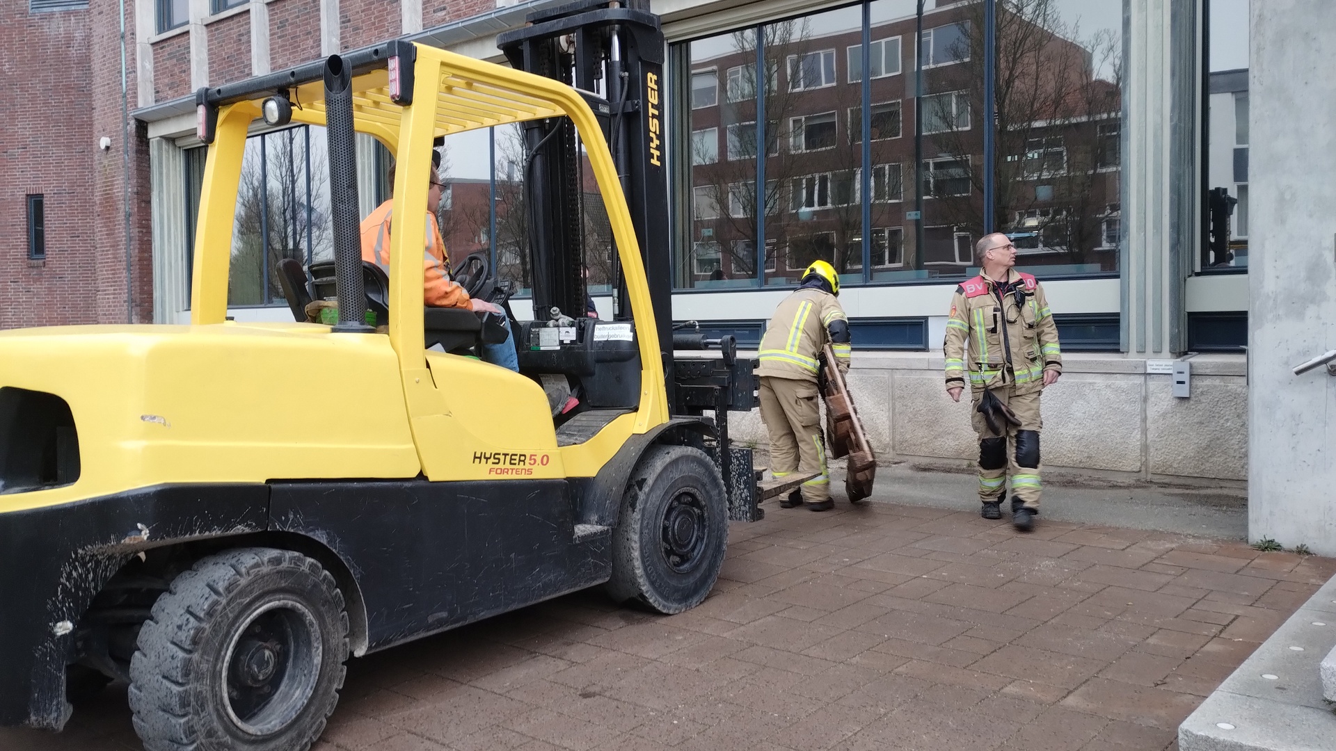 Met behulp van een heftruck lukte het om half vijf alsnog de man uit zijn benarde positie te bevrijden. Hij leek het goed te maken ondanks de kou en vertrok in een busje van Dromen voor Duchenne.